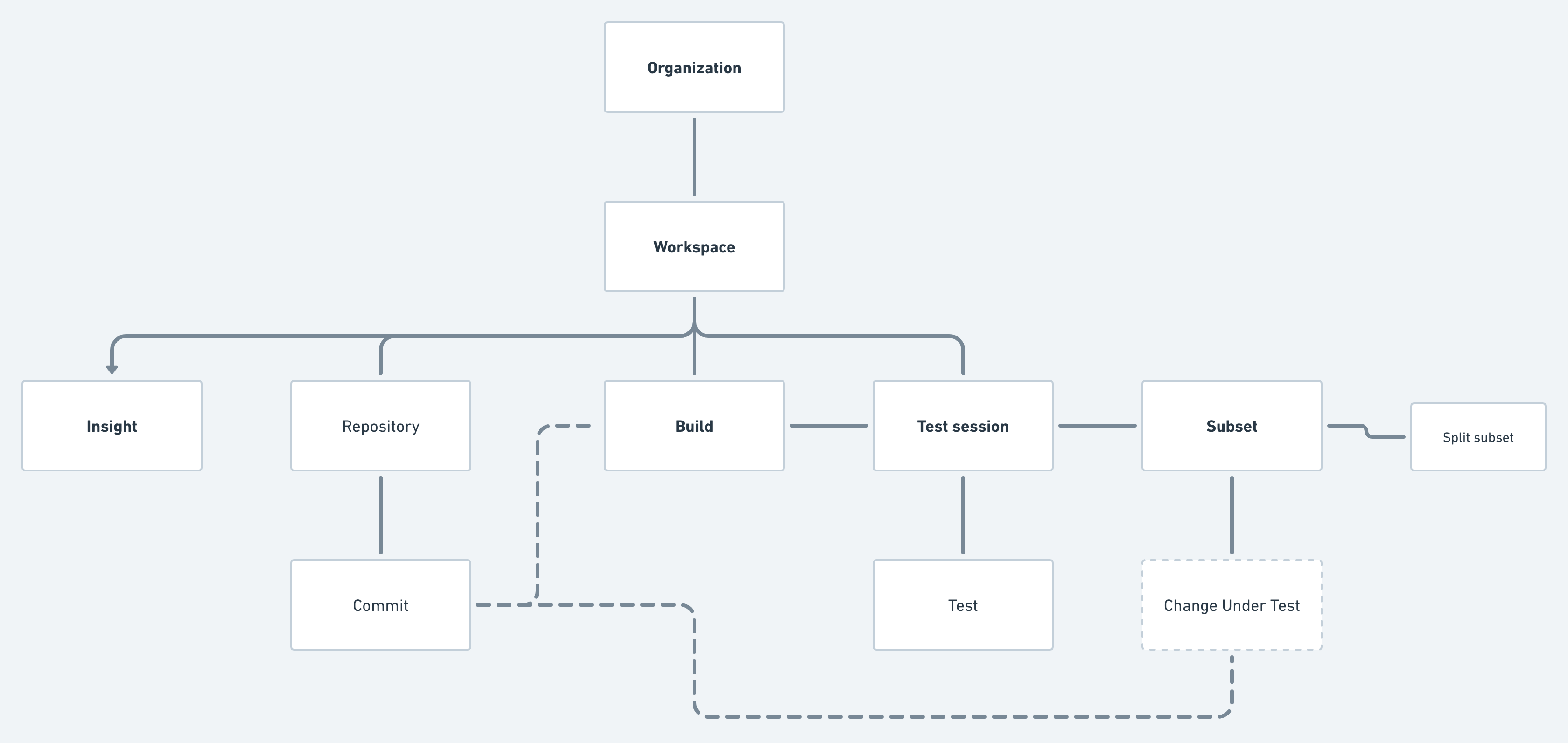 CloudBees Smart Tests’s object model includes concepts that reflect objects in your development/CI environment (like Build and Test Session ) alongside added-value concepts like Subset and Insight .