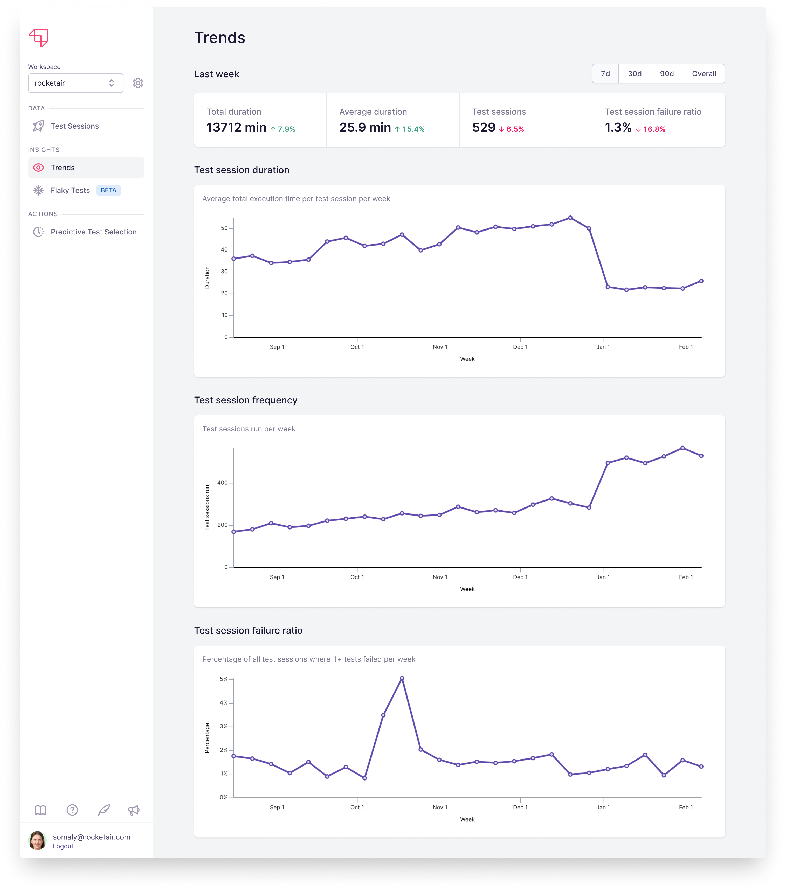 The Trends page shows aggregate info about your test runs, including average test session duration, test session frequency, and how often sessions fail.