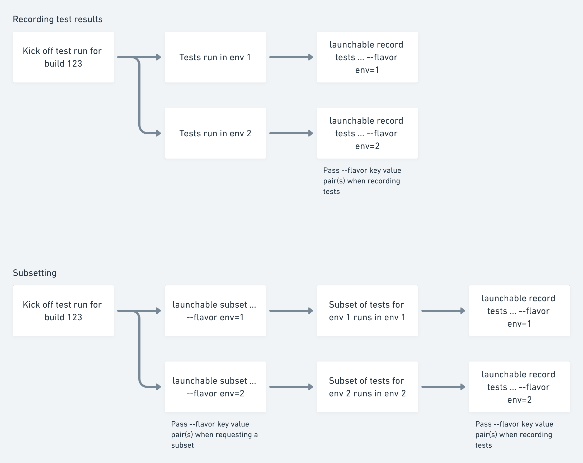 Note: if your workflow involves creating a session externally using smart-tests record session , you should set --flavor in that command (instead of smart-tests subset or smart-tests record tests , as they will be ignored), such as: